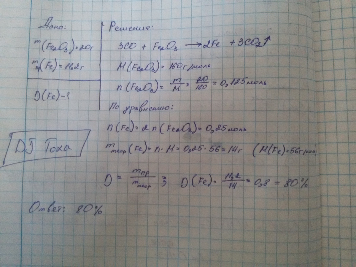 При действии оксида углерода (II) на оксид железа (III) массой 20г получено железо массой 11,2г. Определите выход продукта реакции от теоретически возможного.