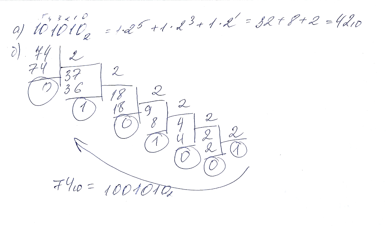 Переведите числа: а) 101010 во 2 ст. из двоичной системы счисления в десятичную; б) 74в 10 ст.=?во 2 ст.