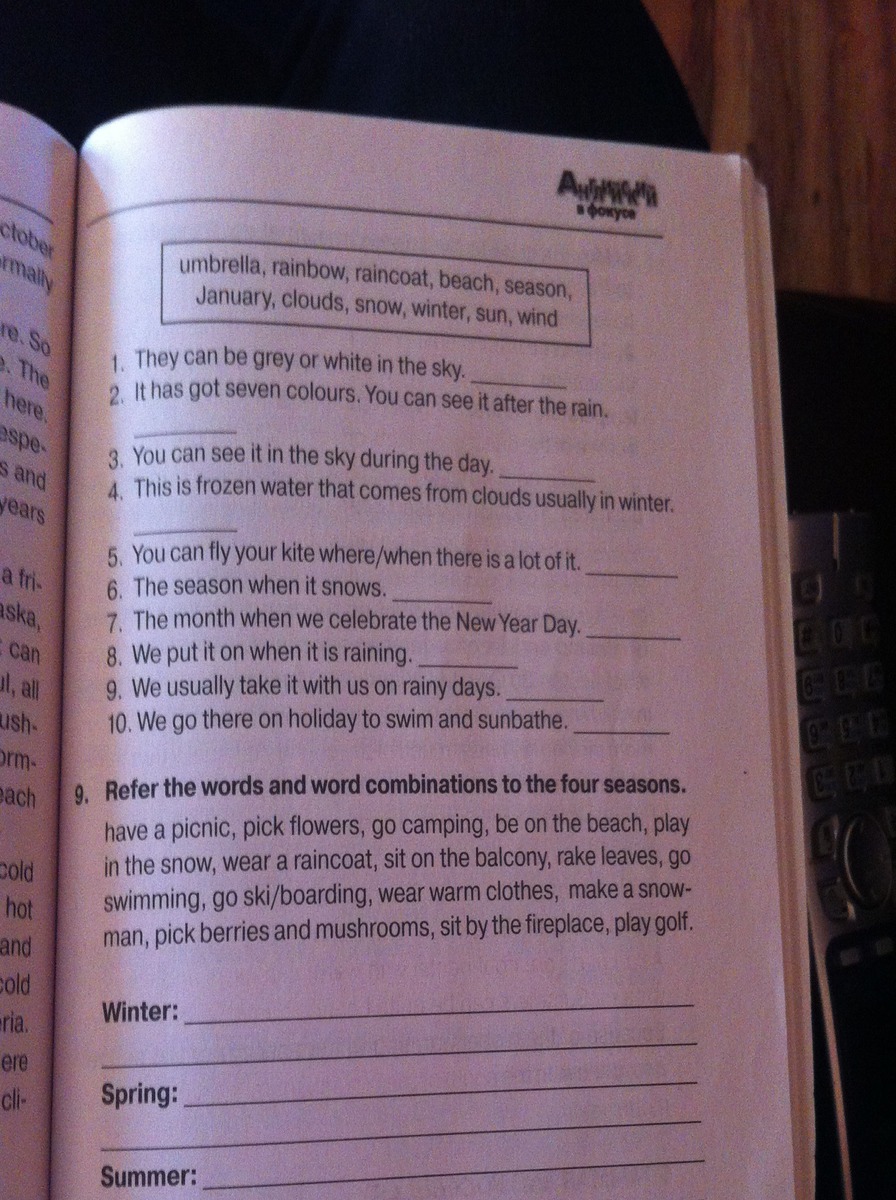 1) clouds 2) rainbow 3) sun 4) snow 5) wind 6) winter 7) January 8) raincoat 9) umbrella 10) beach