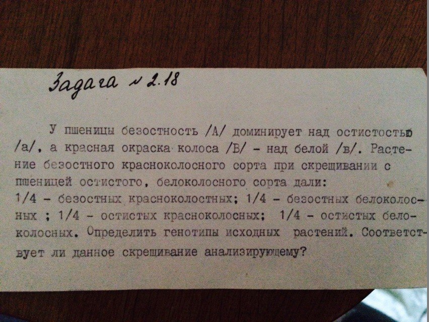 Это скрещивание соответствует анализирующему. С помощью растения с генотипом аавв можно проверить, содержит ли второе растение рецессивные аллели генов окраски (в) и остистости (а). Если содержит, при скрещивании эти растения (АаВв и аавв) дают потомство с четырьмя разными фенотипами.