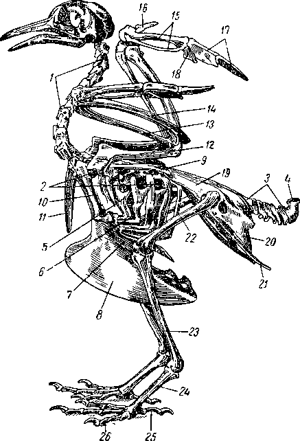 Скелет голубя (по Брэму): 1 — шейные позвонки, 2 — грудные позвонки. 3 — хвостовые позвонки, 4 — копчиковая кость, 5 — спинная часть ребра с крючковидным отростком, 6 — брюшная часть ребра, 7 — грудина, 8 — киль грудины, 9 — лопатка, 10 — коракоид, 11 — ключица, 12 — плечо, 13 — лучевая кость, 14 — локтевая кость, 15 — пясть. 16 — I палец, 17 — II палец, 18 — III палец, 19 — подвздошная кость, 20 — седалищная кость, 21 — лобковая кость, 22 — бедро, 23 — голень, 24 — цевка, 25 — I палец, 26 — IV палец