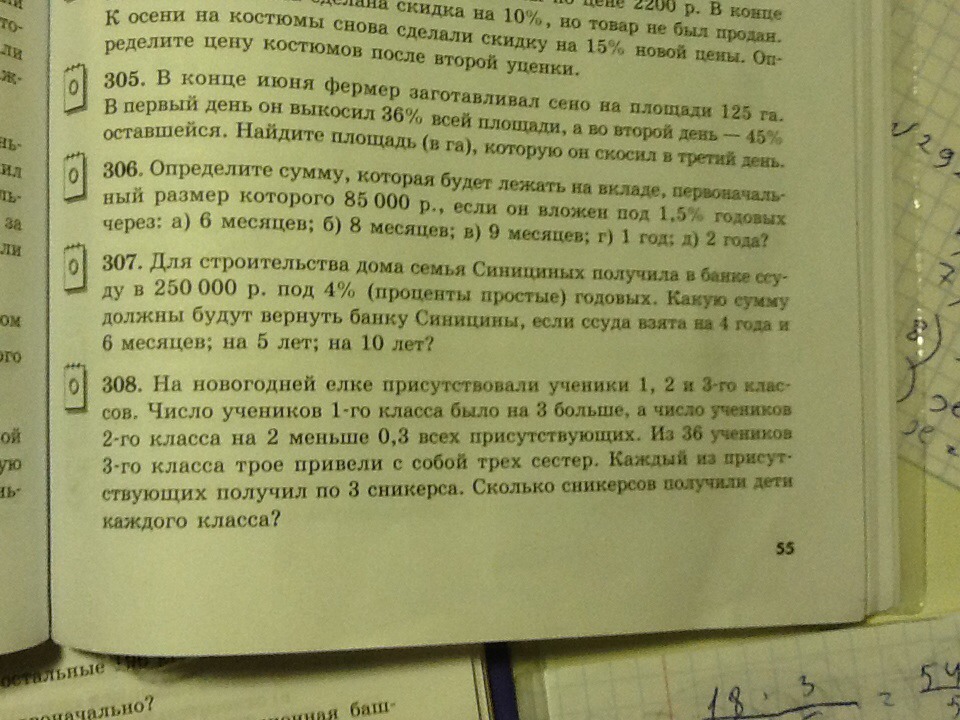 Пусть х - число всех присутствующих. Тогда 0,3х+3 - число учеников 1-го класса, 0,3х-2 - число учеников 2-го класса, а 36+3=39 - число учеников 3-го класса. Составляем уравнение: 0,3х+3 + 0,3х-2 + 39 = х. Упрощаем и решаем уравнение: 0,4х=40, х=100. Теперь можем найти сколько сникерсов раздали в каждом классе. В первом классе: (0,3х+3)*3= (0,3*100+3)*3=99 (шт.) Во втором классе: (0,3х-2)*3= (0,3*100-2)*3=84 (шт.). В третьем классе: 39*3= 117 (шт.). Можем проверить:99+84+117= 300, что в три раза больше, чем учеников.