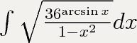 \int \sqrt{\frac{36arcsinx}{1-x^2}}dx=6\int \frac{\sqrt{arcsinx}}{\sqrt{1-x^2}}dx=\\=[d(arcsinx)=\frac{dx}{\sqrt{1-x^2}}\Rightarrow dx=\sqrt{1-x^2}*d(arcsinx)]=\\=6\int\frac{\sqrt{arcsinx}}{\sqrt{1-x^2}}*\sqrt{1-x^2}d(arcsinx)=6\int (arcsinx)^\frac{1}{2}d(arcsinx)=\\=6*\frac{(arcsinx)^\frac{3}{2}}{\frac{3}{2}}+C=4(arcsinx)^\frac{3}{2}+C
