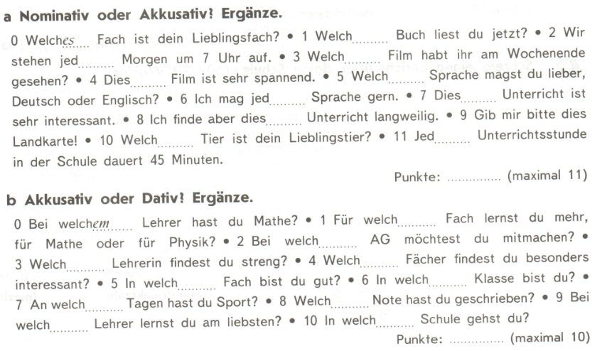 b) welches Fach, welcher Arbeitsgruppe, welche Lehrerin, welche Fächer, welchem Fach, welcher Klasse, welchen Tagen, welche Note, welchem Lehrer, welcher Schule
