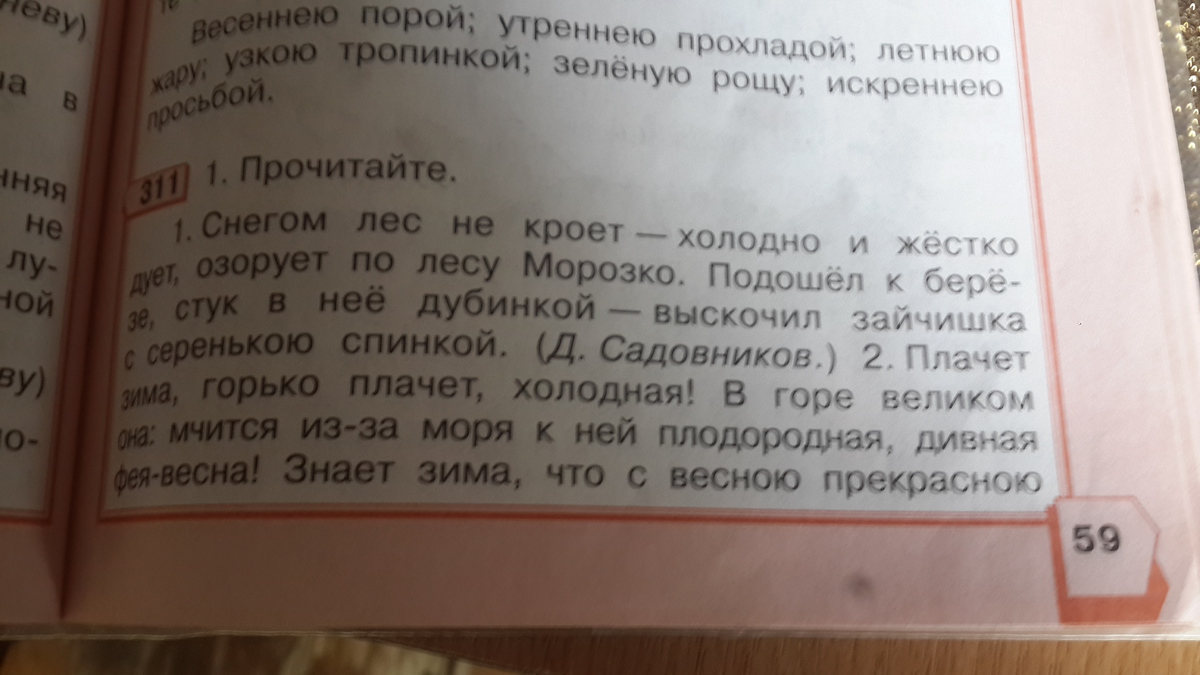 1.) С сереньк(ою) спинк(ой) ( Ж.Р., ТВ.П. ) , зим(а) холодн(ая) ( Ж.Р., ИМ.П. ) , плодородн(ая) и дивн(ая) фе(я) - Весн(а) ( Ж.Р, ИМ.П. ) , с весн(ою) прекрасн(ою) ( Ж.Р., ТВ.П. ) , над не(ю) несчастн(ою) (Ж.Р., ТВ.П. ) .