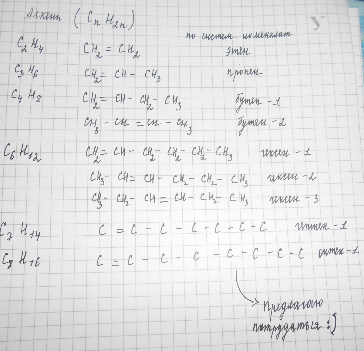 Алкены - это такие углеводороды, которые содержат одну двойную связь между атомами углерода. Общая формула алкенов