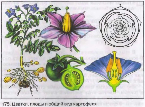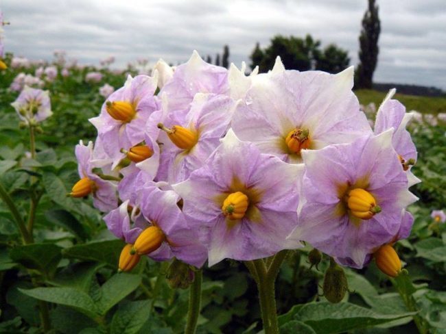 Картофель образует мощный куст, который к середине лета зацветает белыми или розоватыми цветами. Лепестки срастаются и из образовавшейся трубочки красиво выглядывают тычинки и пестик.
