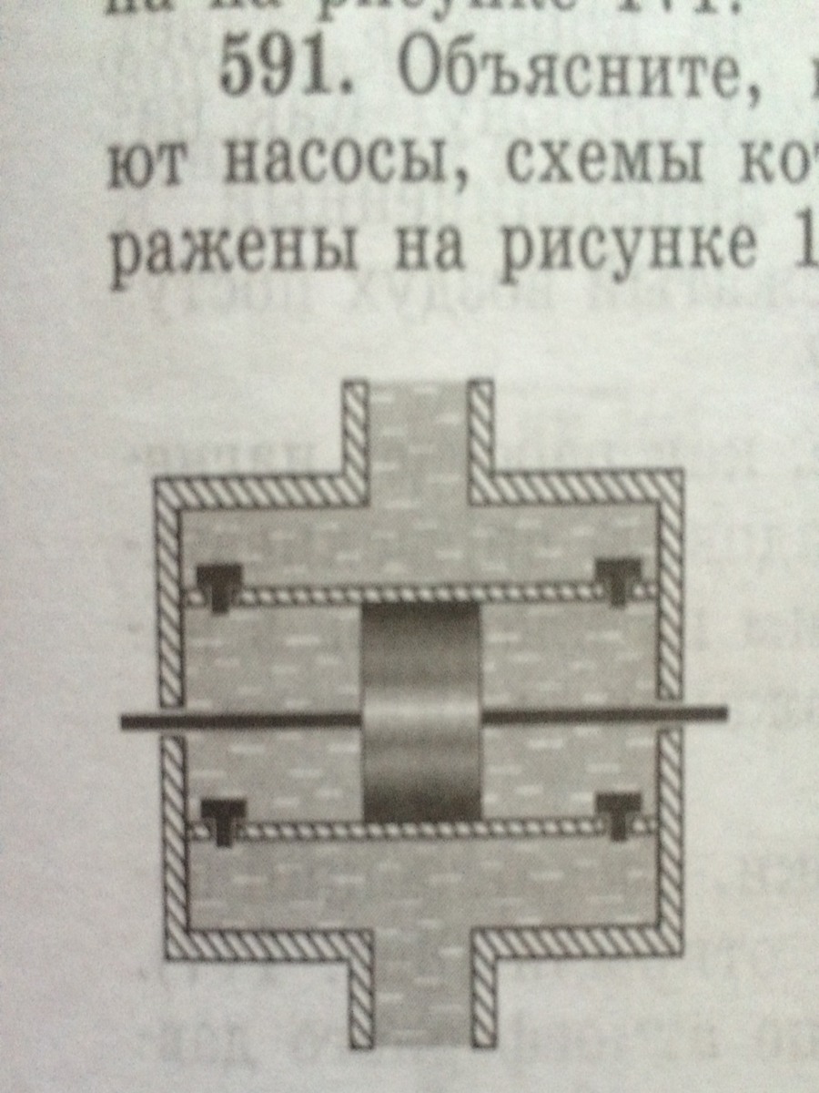 Насос непрерывного действия. Клапаны работают попарно, по диагонали. Когда поршень движется влево, впуск происходит через нижний правый клапан, выпуск через левый верхний, и наоборот.