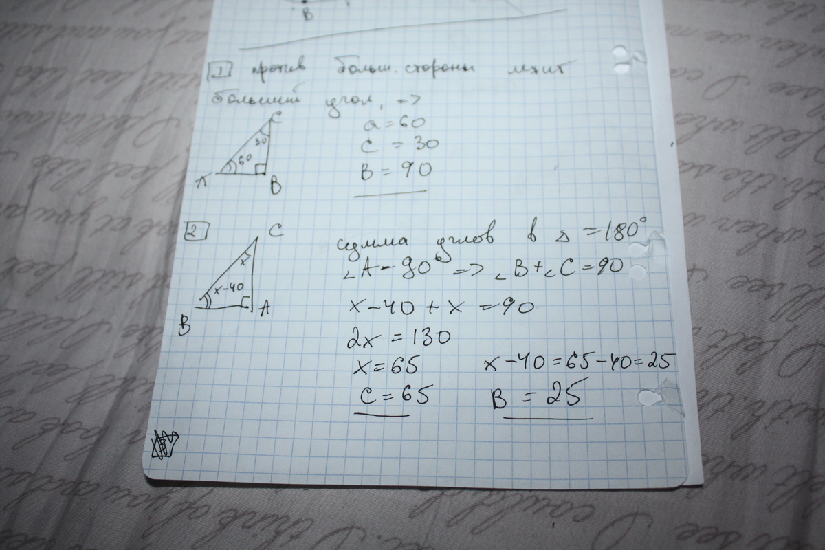 1.один из углов треугольника прямой, значит 90 градусов ( из усл)