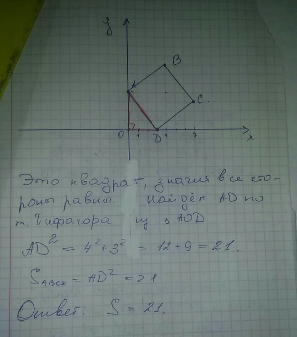 найти площадь квадрата, вершины которого заданы координатами в декартовой системе координат А(0;4), В(4;7;),С(7;3),D(3;0)