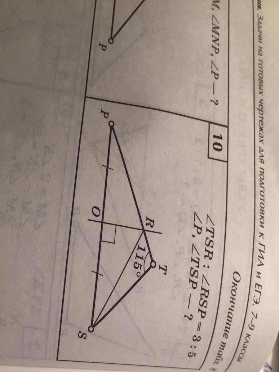 Так как RO и высота, и медиана к PS, то треугольник PRS - равнобедренный. Углы при основании равнобедренного треугольника равны, значит уголRPS=уголRSP=5x, тогда угол TSR=3x. Сумма углов треугольника равна 180, значит 115+5x+5x+3x=180, 13x=65, x=5. Угол P = 5x=5*5=25. Угол TSP=5x+3x=8x=8*5=40.