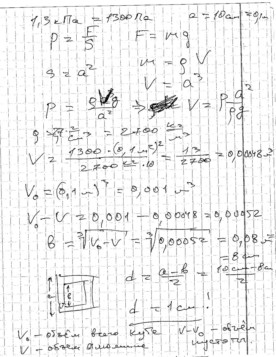 Полый алюминиевый куб с длиной ребра 10 см оказывает на стол давление 1,3 кПа.Какова толщина стенок куба? Ответ должен получится 1 см