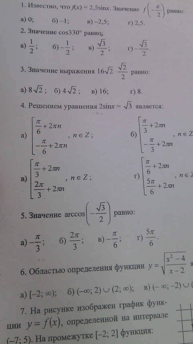 5. arccos(-√3/2)= π-arccos(√3/2)=π-π/6=5π/6 ответ г)