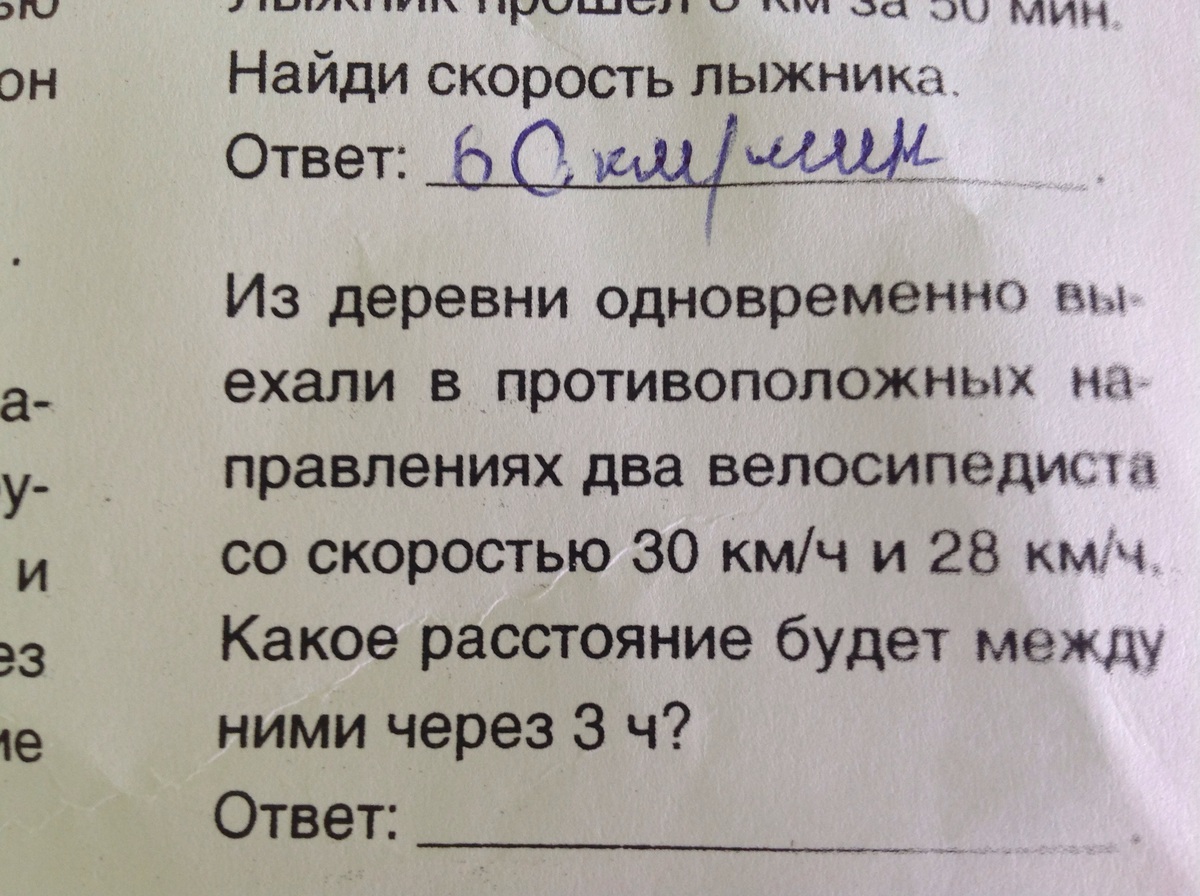 Из деревни одновременно выехали в противоположных направлениях в два велосипедиста со скоростью 30 километров в час и 28 километров в час. какое расстояние будет между ними через 3 часа ?