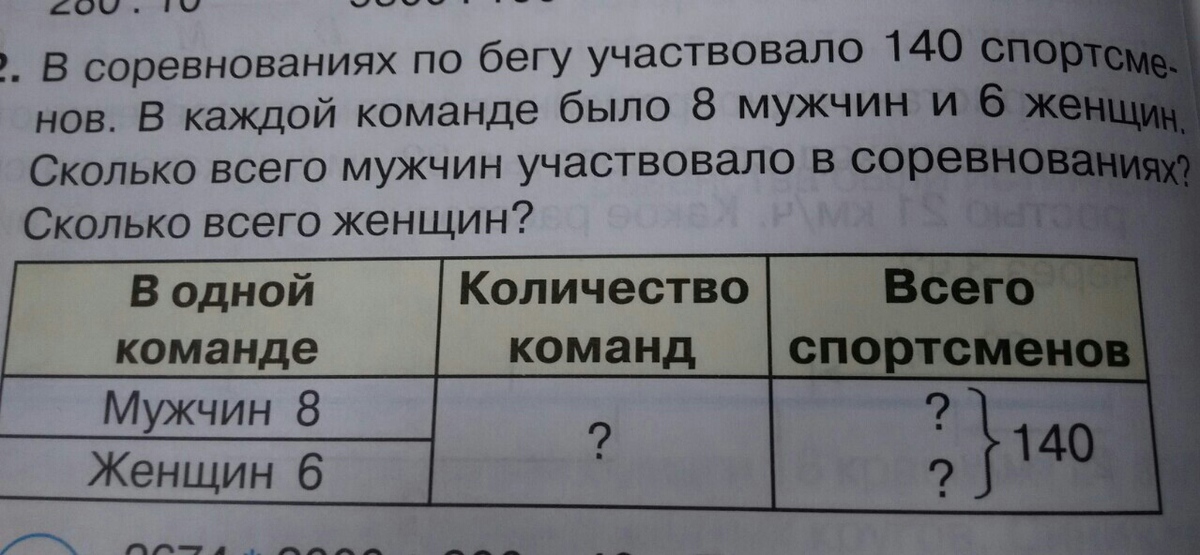 8+6=14 женщин и мужчин в 1 команде 140:14=10 команд получилось 8*10=80 мужчин 6*10=60 женщин Ответ:В соревнованиях участвовало 80 мужчин и 60 женщин