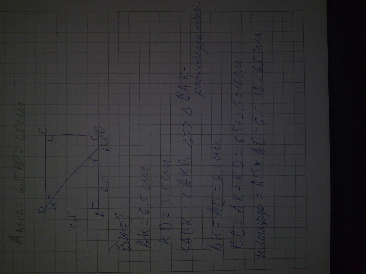 Биссектриса угла B прямоугольника ABCD пересекает сторону AD в точке K так, что AK=6,5 см, KD=3,5 см.Чему равна площадь прямоугольника?