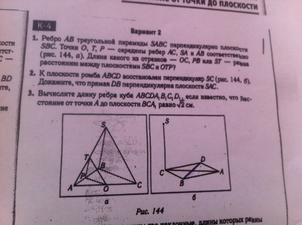 1)Соединив середины ребер мы получим средние линии в треугольниках. Средняя линия параллельна основанию, значит РТ параллельна ВS, TO парал. SC, PO парал. ВС. По признаку парал.плоскостей имеем, что так как две прямых в одной плоскости парал.двум прямым другой плоскости, то они параллельны, значит плоскость ОТР параллельна порскости SBC, и тогда АS перпендикулярна не только SBC, но и ОТР. Получили, что РВ высота между SBC и OTP, значит PB - искомое расстояние между плоскостями.
