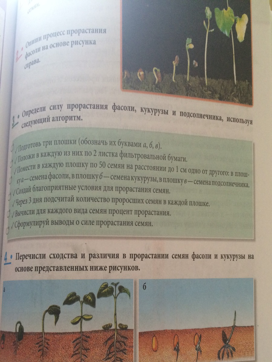 у семян кукурузы и фасоли первым появляется зародышевый корешок, который укрепляет растение в грунте. Затем появляется стебель, а позже листья.