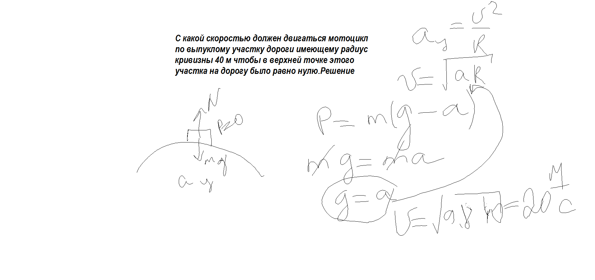 С какой скоростью должен двигаться мотоцикл по выпуклому участку дороги имеющему радиус кривизны 40 м чтобы в верхней точке этого участка на дорогу было равно нулю.Решение