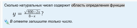 Область определения функции (ООФ) определяется из условий: 400-2х>=0 и x-8<>0, получаем, что x<=200 и х<>8. В ООФ входят первые двести натуральных чисел исключая восемь, значит в ответе пишем: 199.