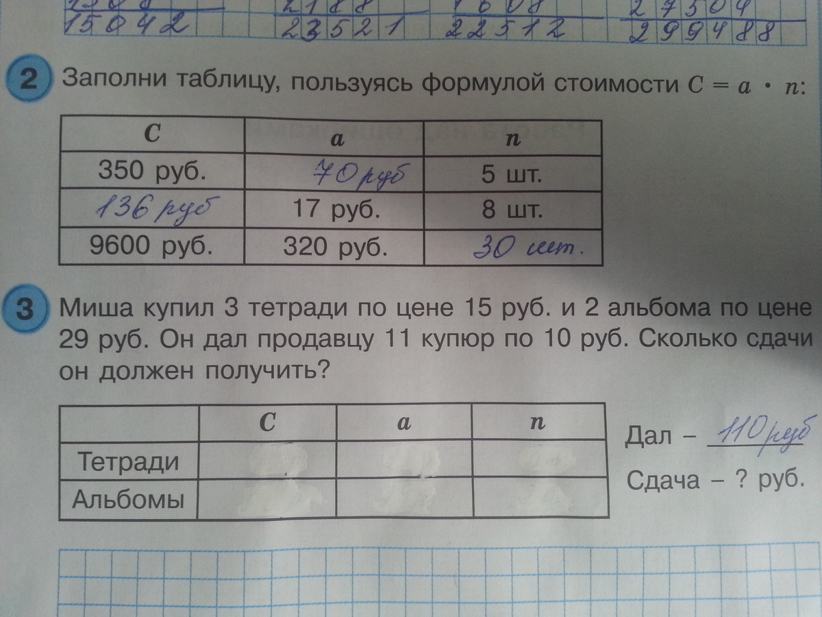 3*15=45 руб цена 3 тетрадей 3*29=58 руб цена 2 альбомов 45+58=103 руб цена покупки 11*10=110руб денег дал Миша продавцу 110-103=7 руб сдачи получит Миша