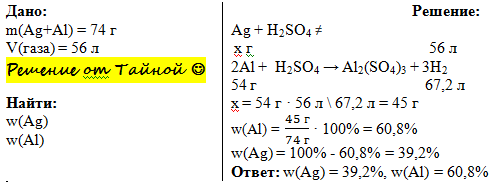 Смесь алюминия и серебра массой 74г обработали с раствором серной кислоты. в Результате получили газ объемом 56 л. Определите массовые доли смеси