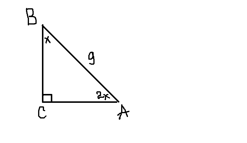 т.к. сумма углов в треугольнике равна 180 градусов, значит получим А+В+С=180, С=90, А=2х, В=х, 2х+х+90=180, 3х=90, х=30, угол В=30 градусов, угол А=60 градусов, а т.к. в прямоугольном треугольнике напротив угла в 30 градусов лежит катет, равный половине гипотенузы, значит АС=1/2АВ, АВ=9, АС=9/2=4,5, Ответ: катет АС=4,5.
