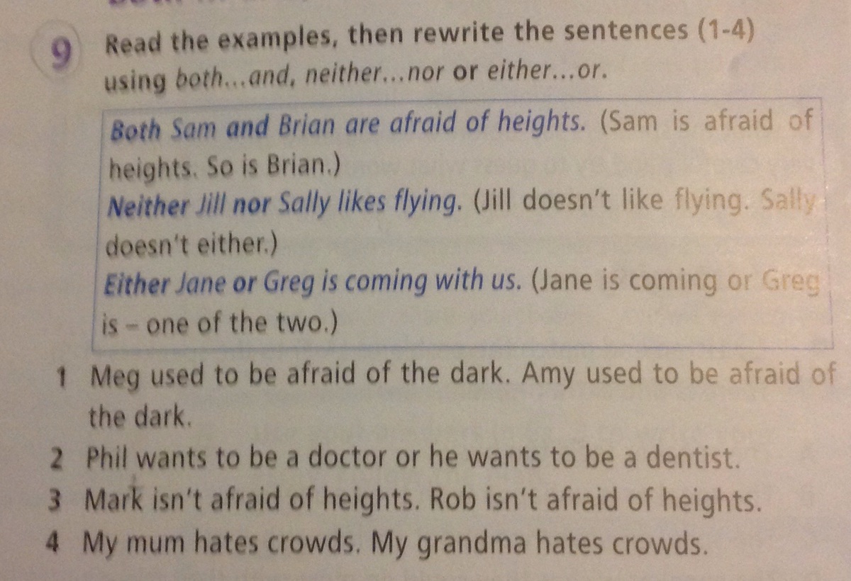 1. Both Meg and Amy used to be afraid of the dark. (Meg used to be afraid of dark. So did Amy.)