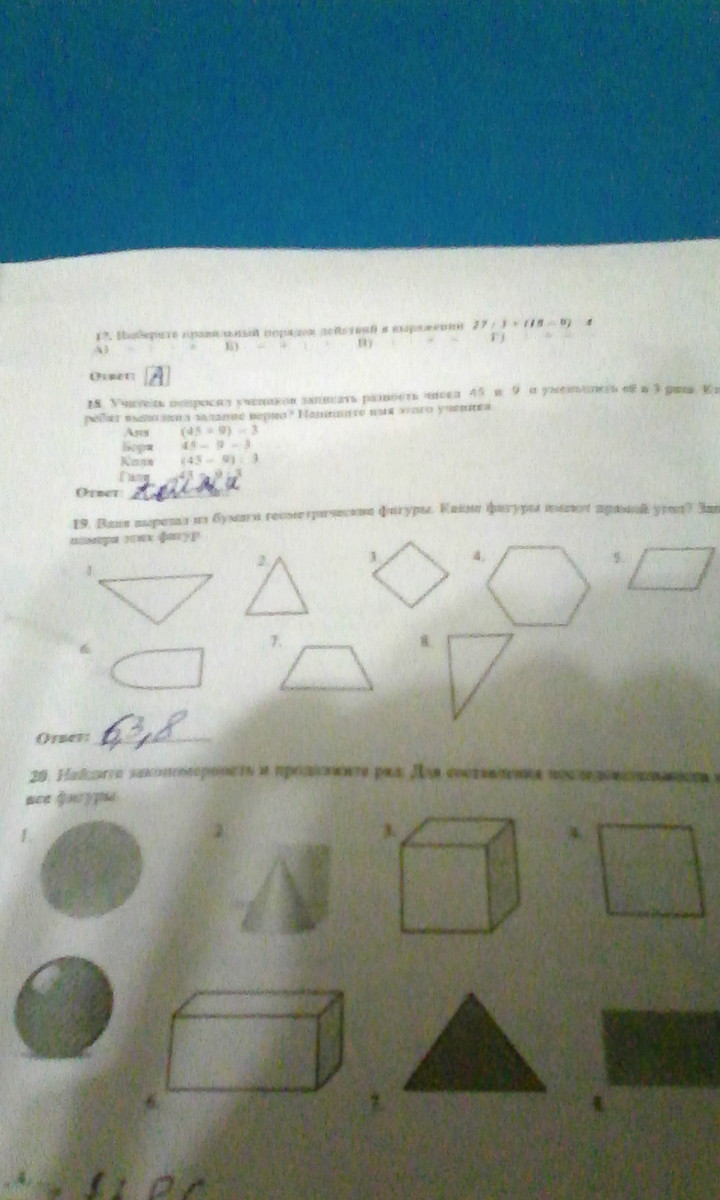 Ваня вырезал из бумаги геометрические фигуры. какие фигуры имеют прямой угол? запишите номера этих фигур