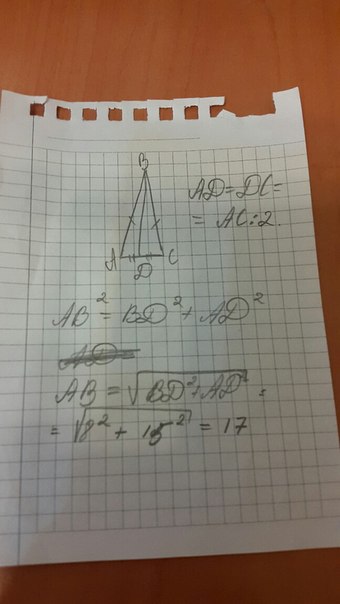 Помогите ! В равнобедренном треугольнике известны основание,равное 30 см.,и высота ,проведённая к основанию ,равная 8 см. Найдите боковую сторону треугольника.Спасибо большое!