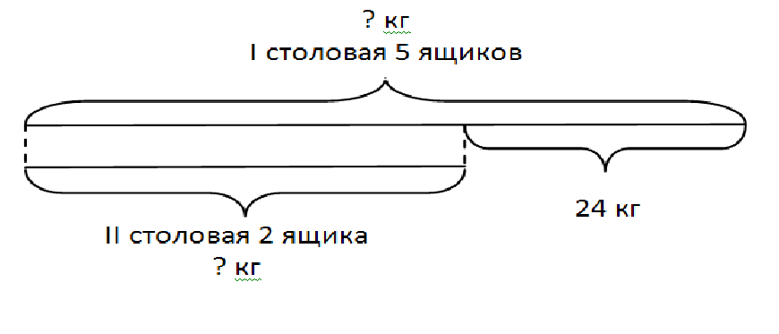 В одну столовую привезли 5 одинаковых ящиков фруктов,в другую - 2 таких же ящ. В первую столовую привезли на 24 кг фруктов больше ,чем во вторую. Сколько килограммов фруктов привезли в каждую столовую? Сделай рисунок и реши задачу.