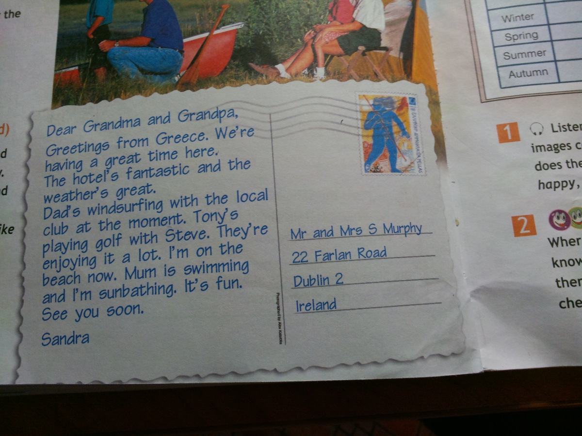 Дорогие дедушка и бабушка, привет из Греции! Мы отлично проводим здесь время. Отель фантастический и погода великолепная.Папа сейчас занимается виндсерфингом в местном клубе.Тони играет в гольф со Стивом. Они развлекаются. Я сейчас на пляже. Мама плавает, а я загораю.Это здорово. До встречи. Сандра