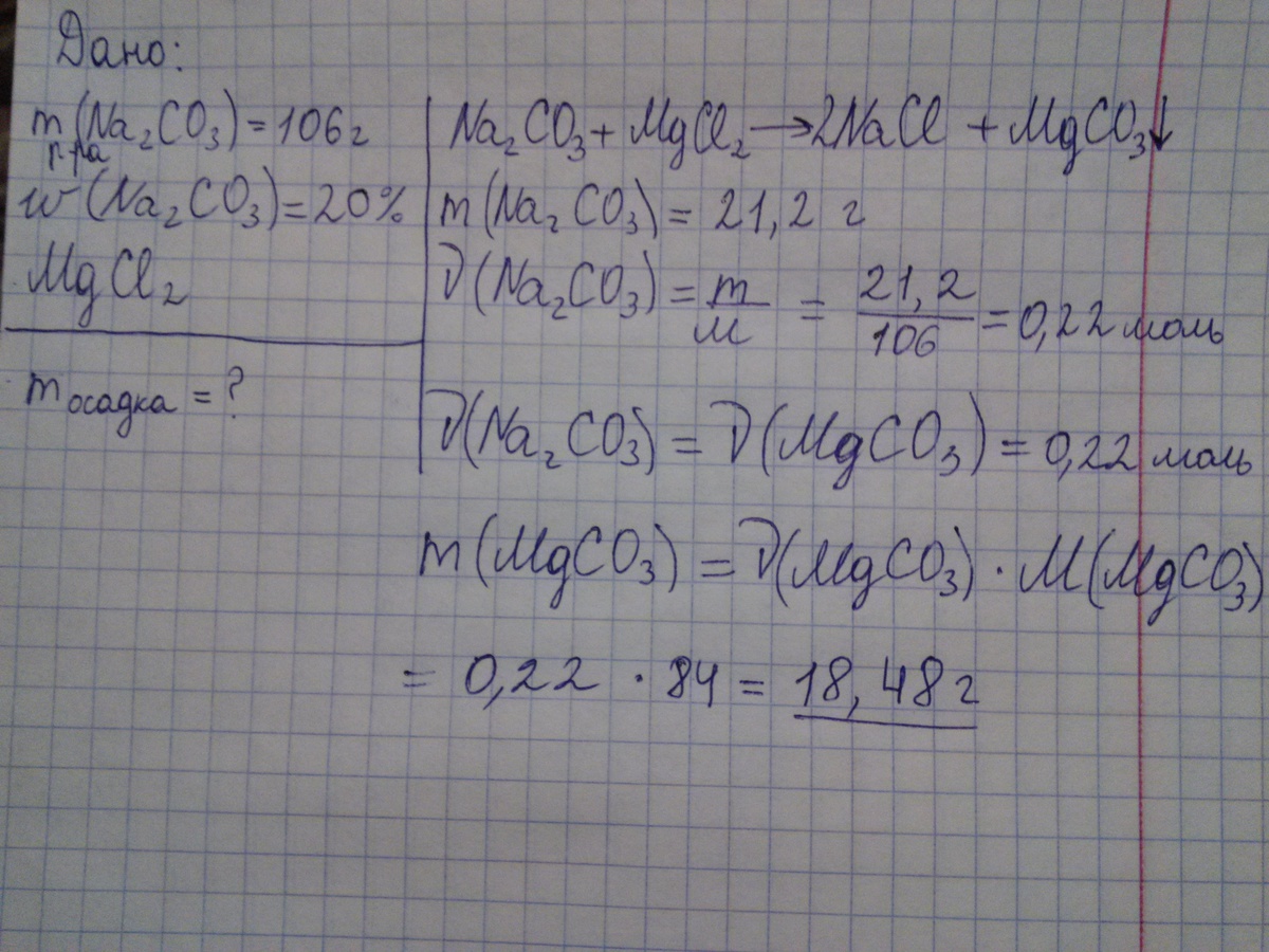 Вычислите массу осадка образовавшегося при взаимодействии 106 г 20%-го раствора карбоната натрия с избытком раствора хлорида магния