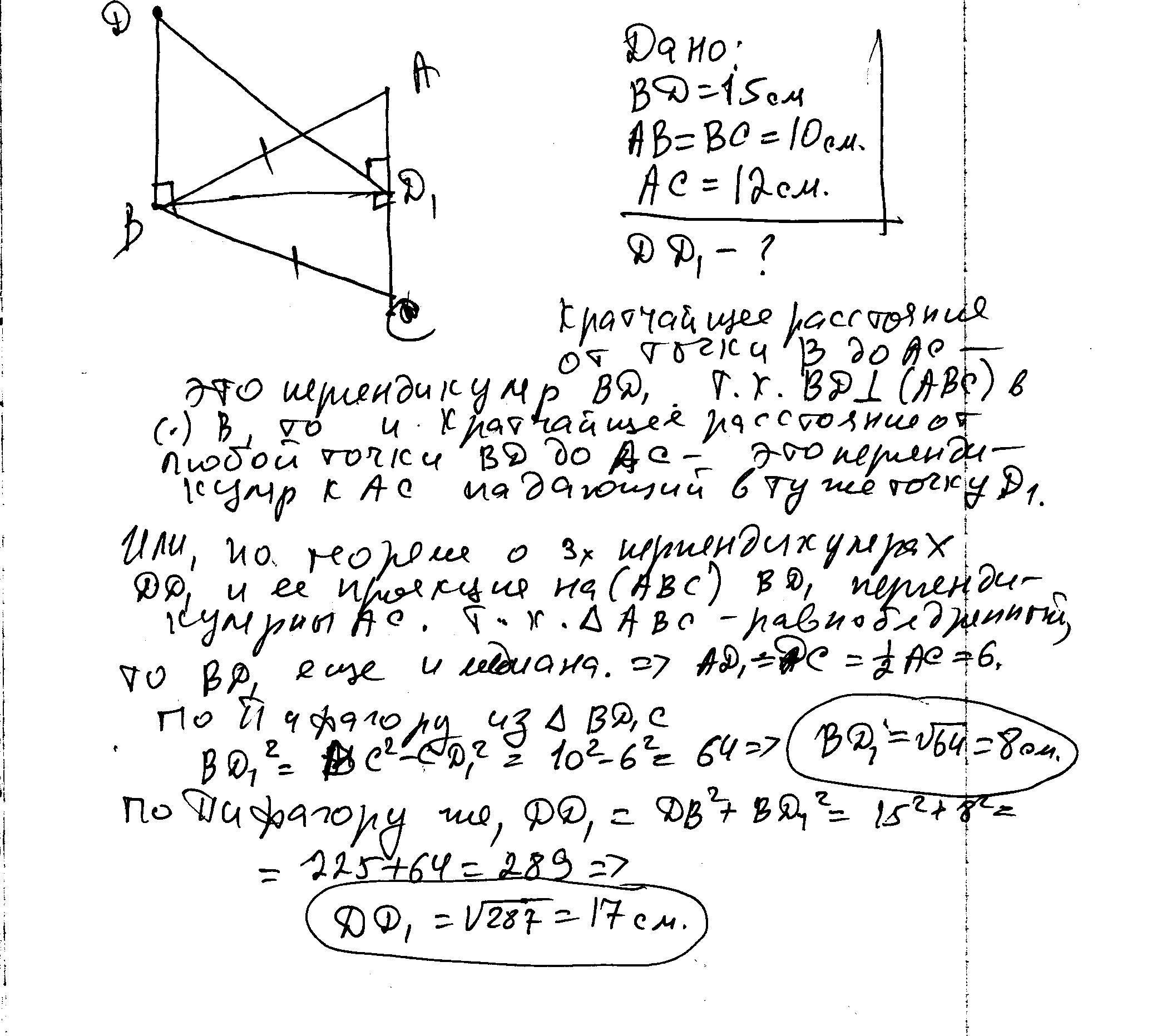 в треугольнике авс ав=вс=10 см, ас= 12 см, через точку d к плоскости авс проведен перпендикуляр вд.найдите расстояние от точки д до ас