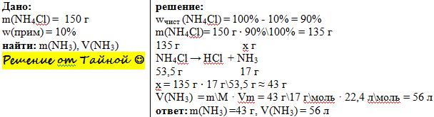 Вычистить массу и объем аммиака, который можно получить при разложении хлорида аммония массой 150грамм содержащего 10% помесей