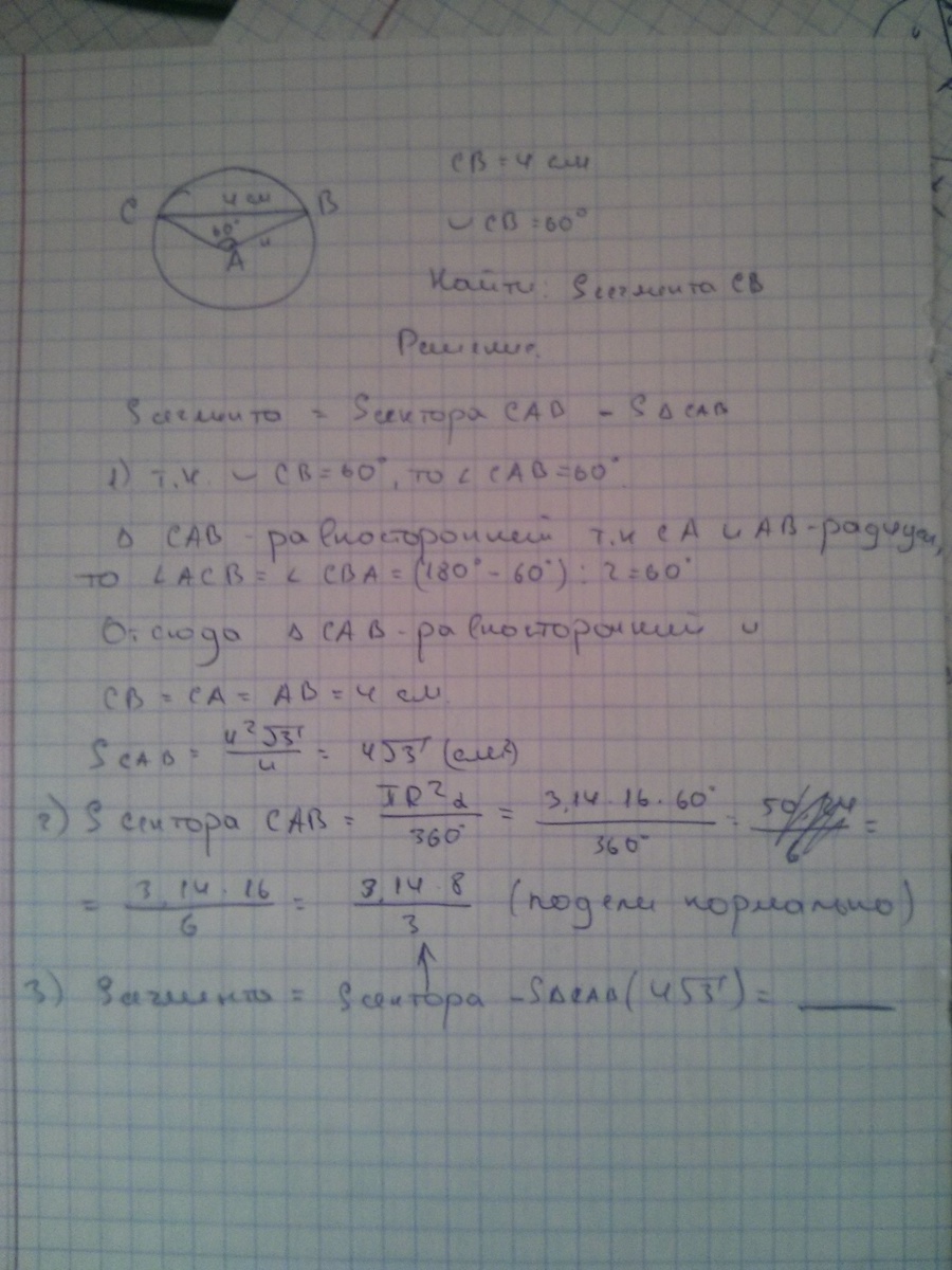Найдите площадь фигуры ,ограниченной дугой окружности и стягивающей ее хордой , если длина хорды равна 4 м , а градусная мера дуги равна 60 градусов