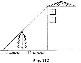 Дерево высотой 5,4 м стоит на расстоянии 14 шагов от дома, на котором установлен прожектор. Тень от дерева равна трём шагам. Какова высота дома в метрах?