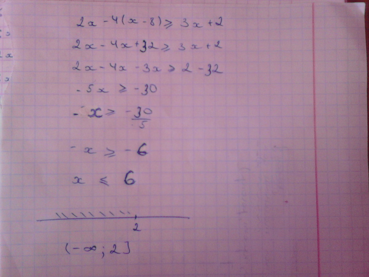 решите неравенство 2x-4(x-8)больше равно 3x+2