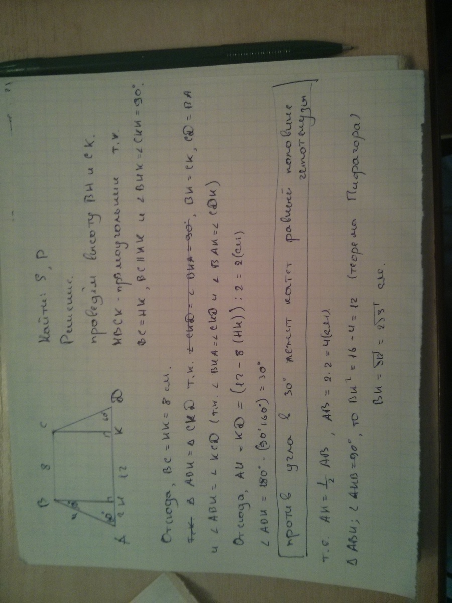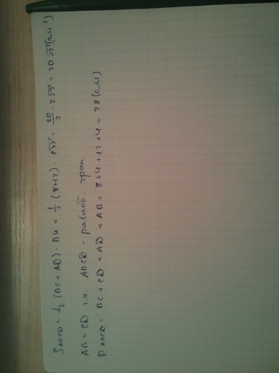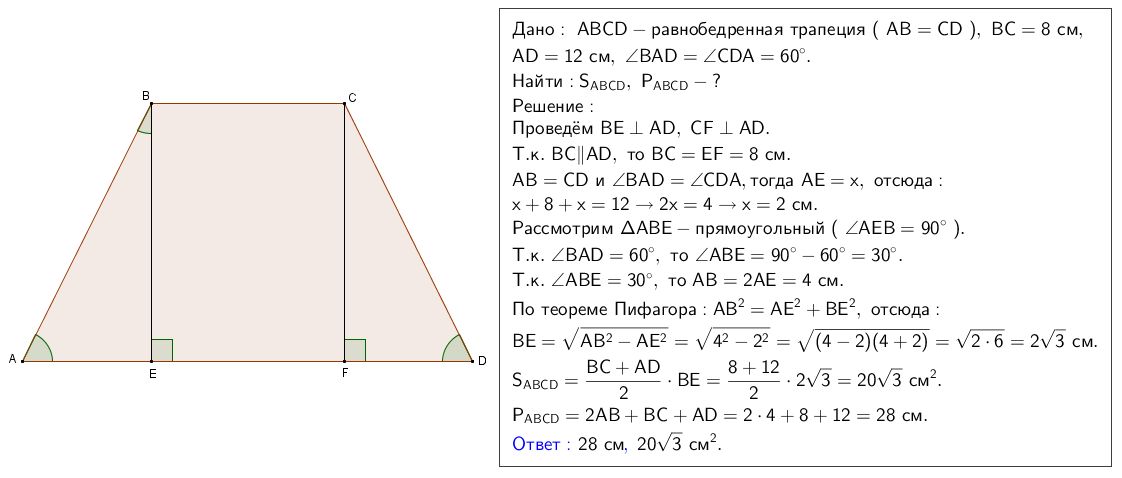В равнобедренной трапеции основания равны 8 см и 12 см, меньший угол равен 60 градусов . Найдите периметр и площадь трапеции.