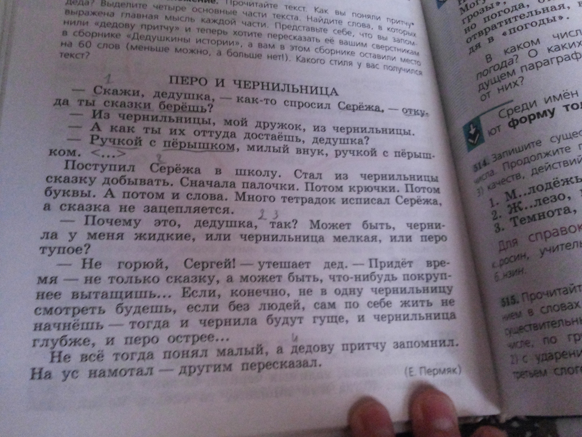 Как -то спросил Сережа у дедушки, откуда тот берет сказки. Дед ответил, что из чернильницы. Он объяснил, что оттуда сначала добывают палочки, а потом и сказка получается. Сережа пошел в школу и начал стараться. Много тетрадок исписал, а сказка не получалась. Дед объяснил мальчику, что нужно дружить с людьми, тогда и перо будет острее. Мальчик вырос и притчу эту нам поведал.