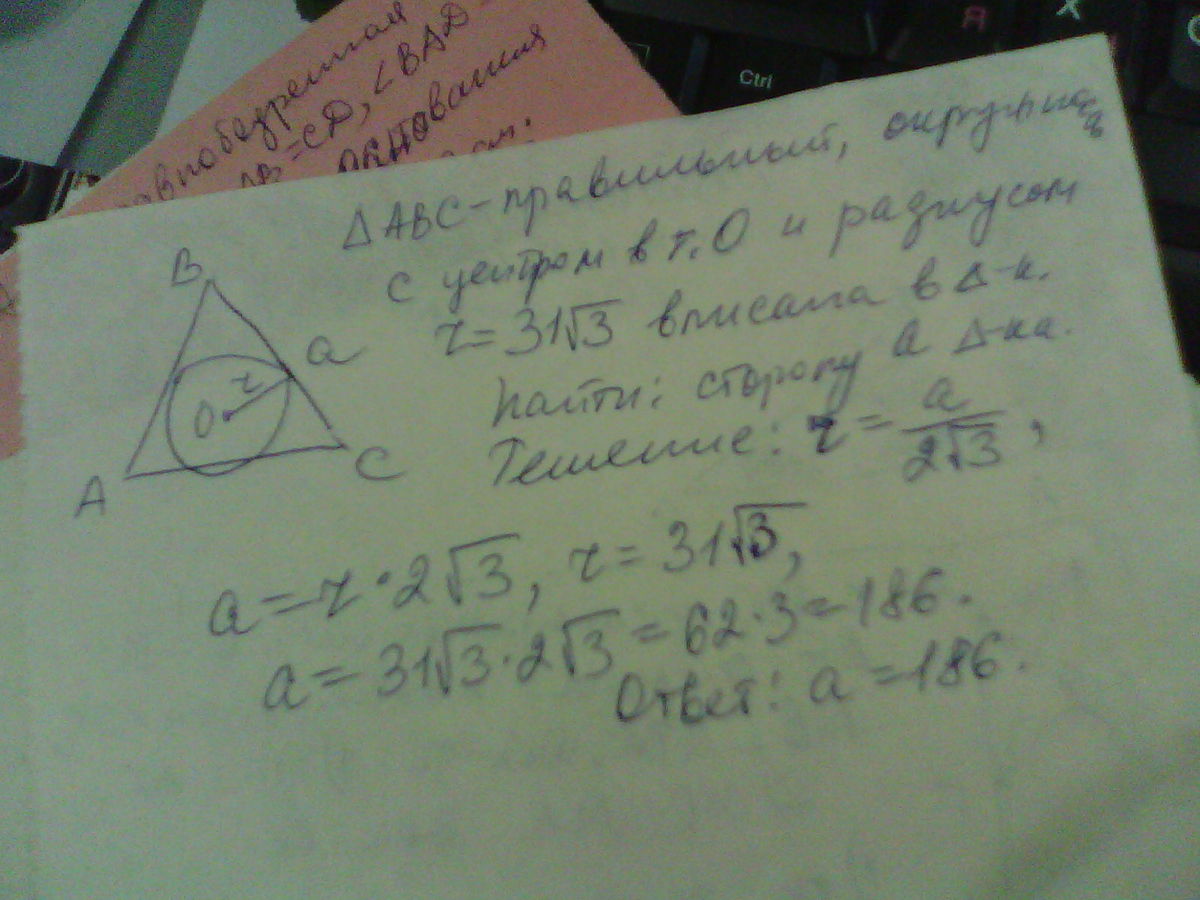 Радиус окружности, вписанной в правильный треугольник, равен 31корней(3) :2. Найдите сторону этого треугольника