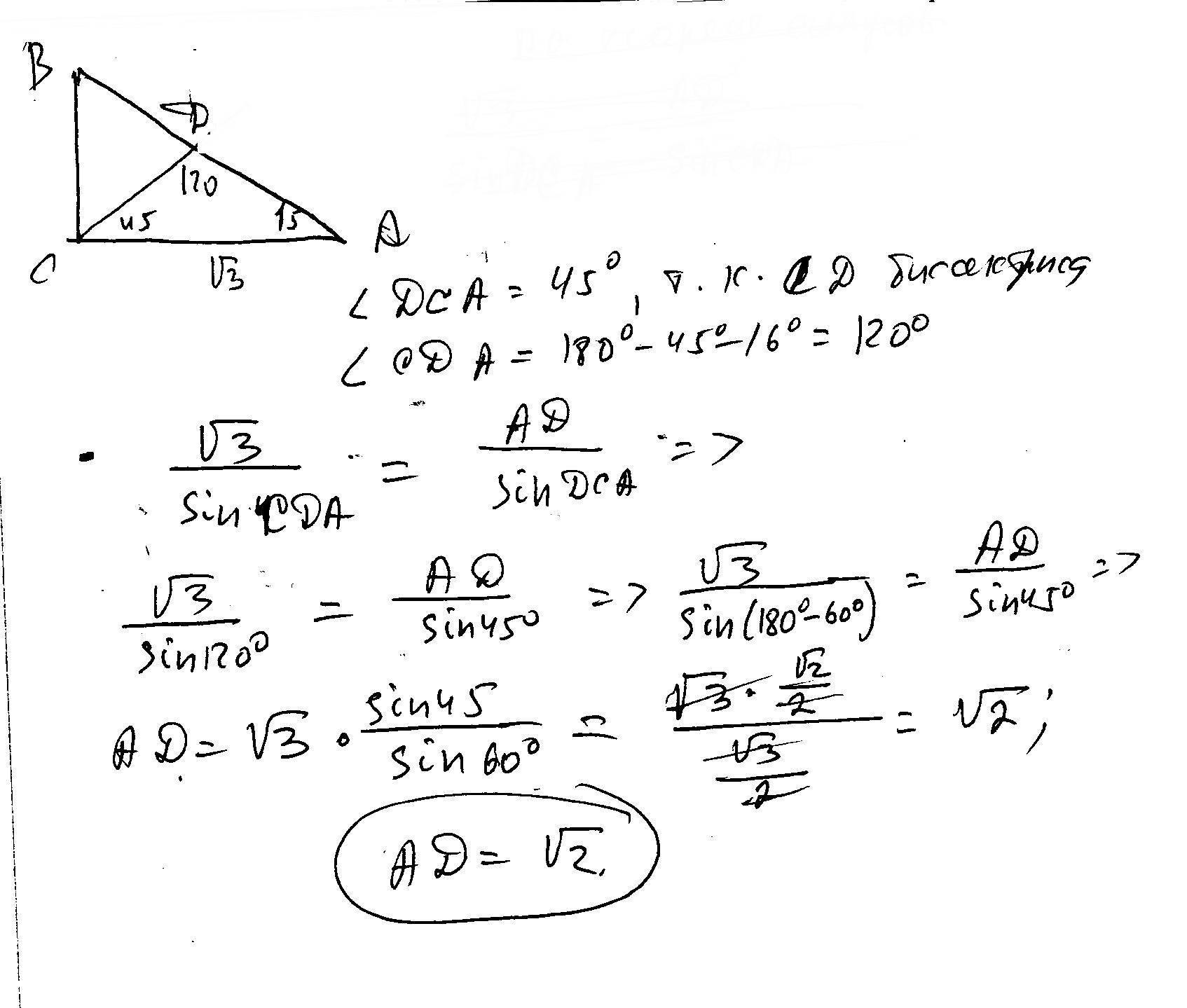В прямоугольном треугольнике ABC угол C=90, CD-бессектриса, угол А=15, АС=корень из 3 найти AD