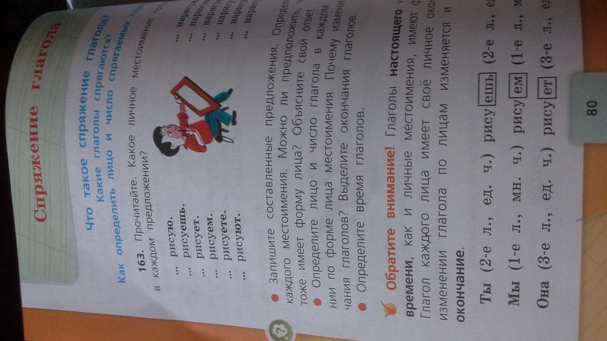Помогите # 163 нужно нужно записать составленные предложения. и определить время глаголов и определить лицо и число глагола в каждом предложении по форме лица местоимения.