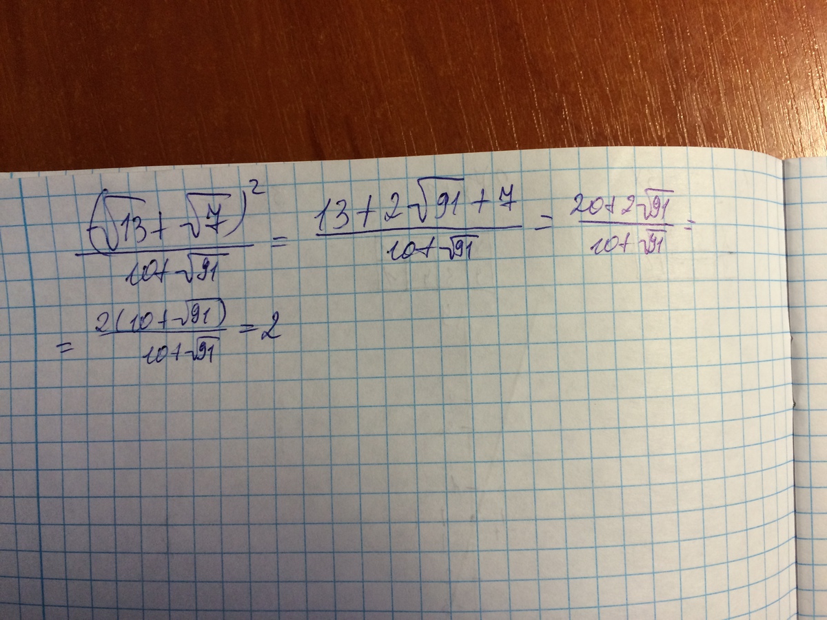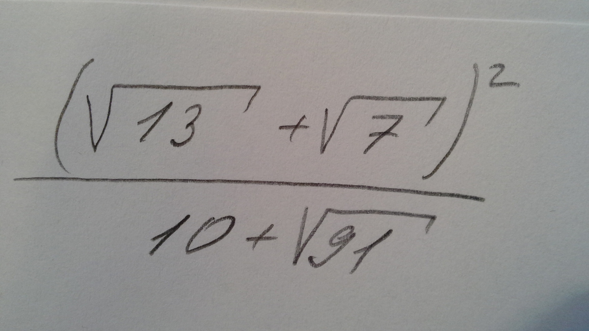 (√13 + √7)^2/(10 + √91) = (13 + 2 *√91 + 7) / (10 + √91) =