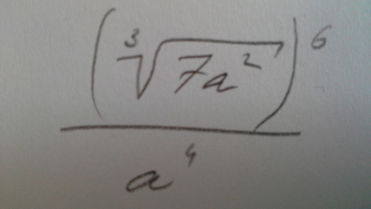 \frac{ (\sqrt[3]{7a^{2} } )^6}{ a^{4} } = \frac{(7 a^{2}) ^ \frac{6}{3} }{ a^{4} } = \frac{(7a^2)^2}{ a^{4} } = \frac{ 7^{2}  a^{4} }{ a^{4} } =49