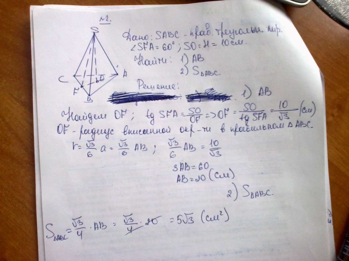 2. В правильной треугольной пирамиде боковое ребро наклонено к плоскости основания под углом а=60, высота пирамиды H=10см. Найти сторону основания пирамиды и площадь основания пирамиды.