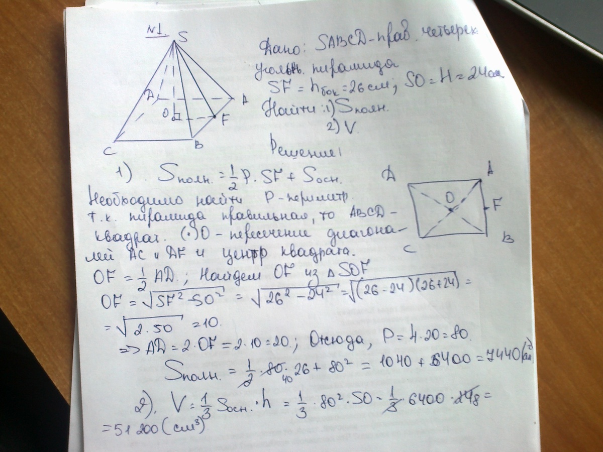 1. В правильной четырёх угольной пирамиде известна апофема hбок.=26см и высота H=24см. Найдите площадь полной поверхности пирамиды и её объём.