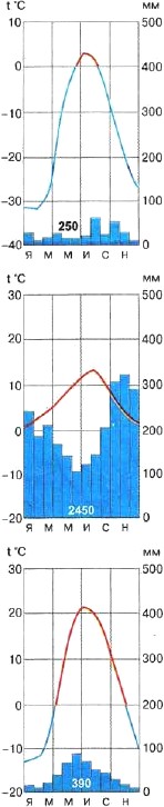 II. Диаграмма – температура января (-0*), температура июля (+12*), количество осадков 2450 мм/год (зимой), это- умеренный морской. Причина большое количество осадков - теплое течение Гольфстрим.