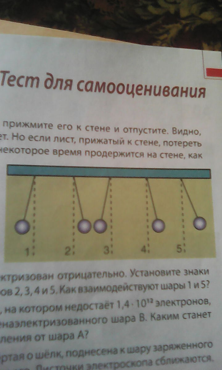 Пять одинаковых шариков подвешенны на шелковых нитях одинаковой длины. Будучи наэлектризованными, они располагаются так, как показано на рисунке. Шарик 1 наэлектризован отрицательно. Установите знаки электрических нарядов шаров 2, 3, 4 и 5. Как взаимодействуют шары 1и 5?