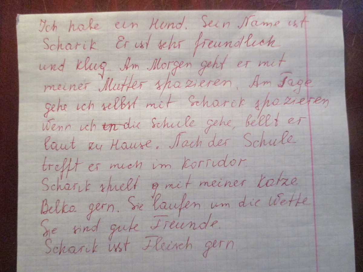 У меня есть собака.По имени Шарик. Он очень дружелюбный и умный. Утром он холит гулять с моей мамой. Днем я сам хожу гулять с Шариком. Когда я иду в школу, он громко лает дома. После школы он встречает меня в коридоре. Шарик охотно играет с моей кошкой Белкой. Они бегают наперегонки. Они хорошие друзья. Шарик охотно ест мясо.